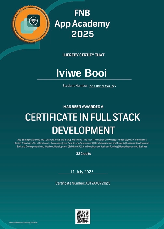 Hello! I'm Iviwe Booi, a passionate Full Stack Developer and final-year Computer Science student at the University of Cape Town (UCT). My journey in the tech world has been fueled by a deep curiosity and a desire to create innovative web solutions that make a difference. With a solid foundation in HTML, CSS, JavaScript, Java, and Python, I have honed my skills through various personal projects that reflect my creativity and technical prowess. I thrive on the challenge of transforming ideas into dynamic and responsive web applications, ensuring that they not only function seamlessly but also provide an engaging user experience.